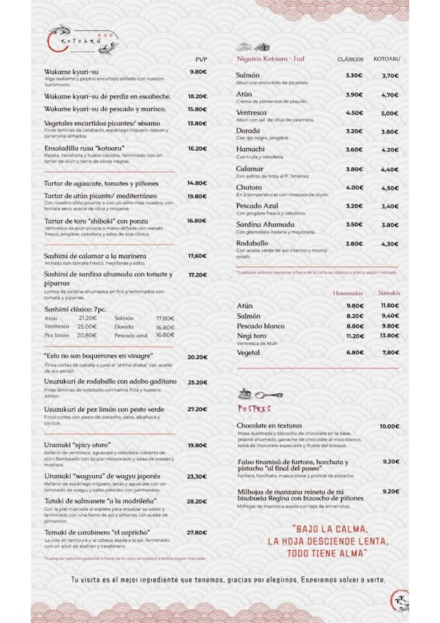 Kotoaru es una taberna japonesa, que ofrece una interpretación personal en la que junta tradición e innovación de la gastronomía nipona y mediterránea. Haciendo un homenaje a la cocina tradicional de sus padres y abuelos, con su hostelería honesta y sin florituras y un producto manejado con: Técnica...
