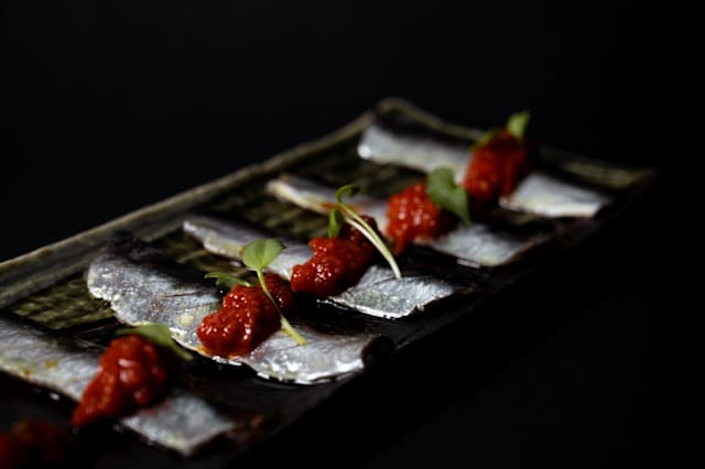 - Lomos de sardina ahumados en frio y terminados con tomate y piparras.