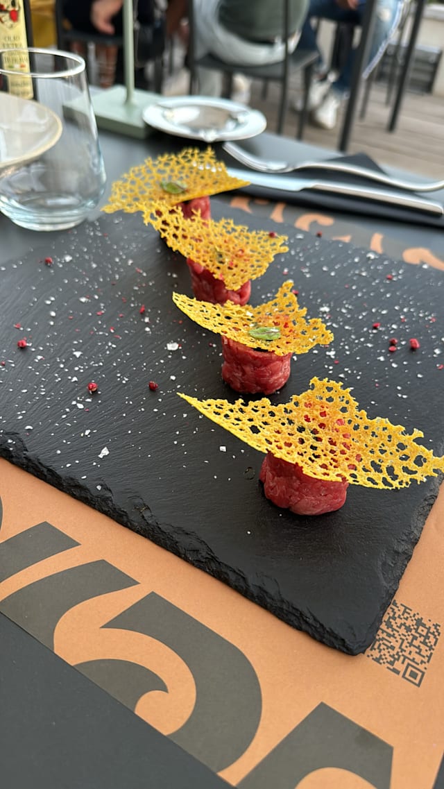 Carne di manzo (120g), aglio nero e chips al curry thailandese