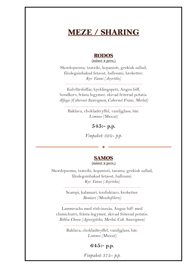 10/10Super nice food and service. We got the full Samos experience with the wine pairing