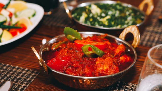 “A succulent lamb curry cooked in a karahi (wok-like pan) with tomatoes, onions, ginger, garlic, and a blend of spices, resulting in a flavorful and aromatic dish with a slight tanginess.”