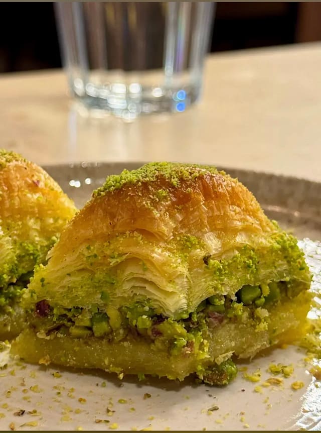- Pâtisserie traditionnelle composée de fines couches de pâte filo, garnie de pistaches d’Antep et nappée d’un sirop léger