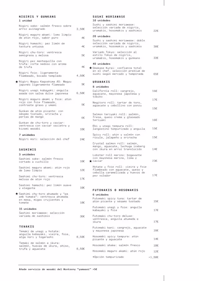 We booked a table at 22h30, when we got there we ordered the degustation menu. We were told it was not available because the kitchen was closing. However, when we booked the table, we were not informed we weren’t going to be able to eat what we wanted. We ended up eating only sushi. The fish was fresh, but the variety was poor, the cut was badly made (sashimi slices almost the size of a napkin and nigiris that crumbled when touched). It looked like a rushed job to get something to the table. The coffee at the end was very bitter. The staff was nice and attentive, but the end result on the plate was lacking.