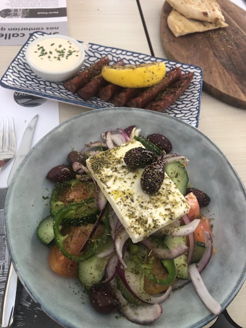 8/10We had the Greek salad to start, was very good…then had the cod tempura and the giortulato (meatball sausage on pita bread with tomato sauce), was ok. Both dishes were served warm, not hot, which took off a bit of the enjoyment for us. A bit on the more expensive side for what it was, at 79€, including a bottle of wine and a small bottle of water, no dessert or coffee.