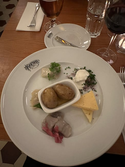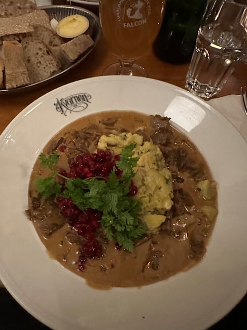 6.5/10Venison stew: meat was extremely dry and tasteless (as if it had been reheated). Luckily it was replaced by decent (but not extremely tasty) meatballs (tried better versions in other Stockholm restaurants). The best dish was the herring toast: nice syrup bread, good presentation and very balanced flavour and texture.
