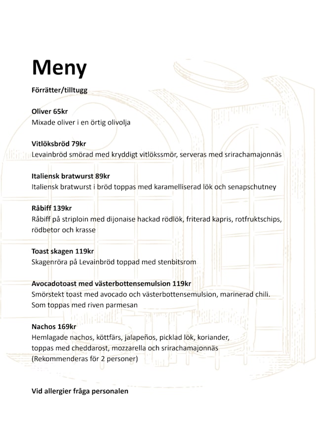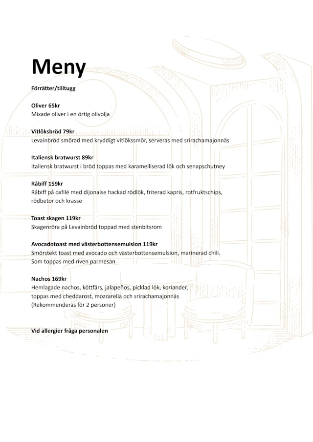 INSIDEREuropeanRegionalScandinavianBurgerPizzaSaladBachelor partyBirthdayBistroContemporary cuisineCreativeGood for a business lunchGood for familiesGood for groupsOutdoor diningRomanticTrendyWith friendsChristmasChristmas and New YearFather's DayNew year's eveGluten freeLactose intoleranceVegetarian dishesChildren's menuDog-FriendlyWheelchair AccessibleWifi