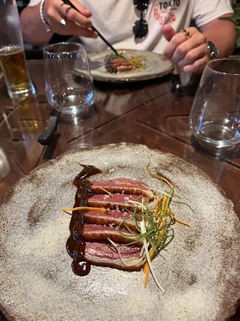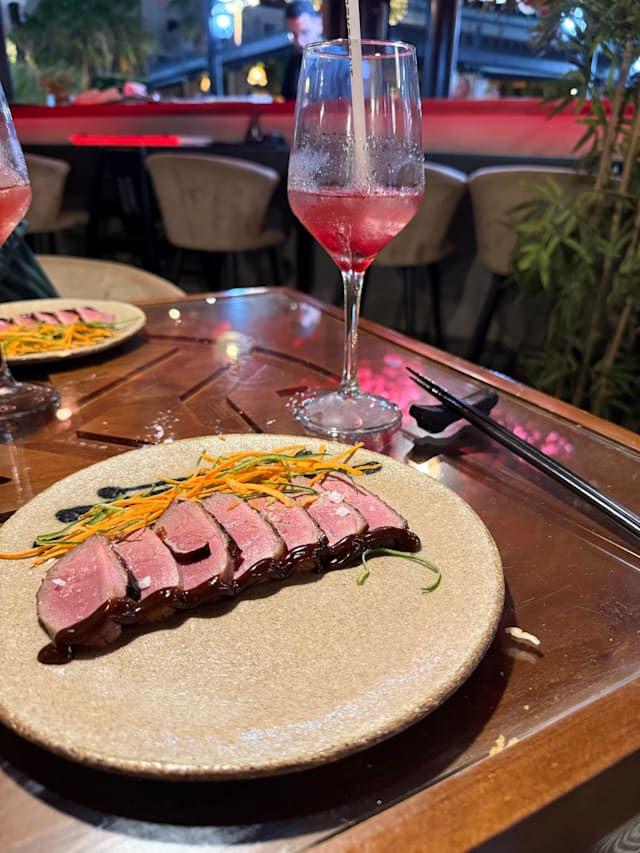 5.5/10The starter I had, the tempura prawns, were delicious. The main I had, the Angus rib, was nice but nothing special. My partner had ordered the duck as a main which was quite cold. The problem was the service. The waitress was friendly and did her best but there were just too many tables for one person to cover. The service was just too slow.