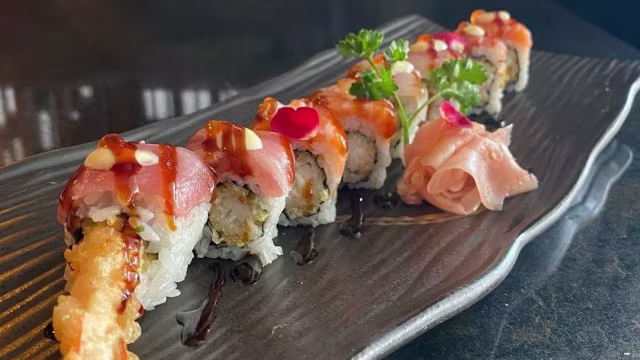 - Involtino di salmone, riso, mango, rucola, granella di pistacchio, salsa speciale 4 pz