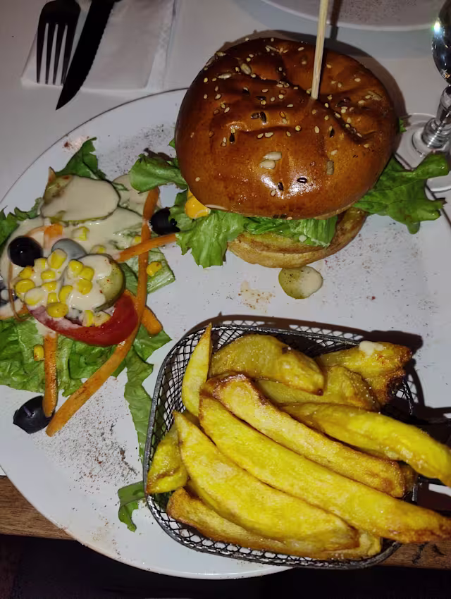 - Steak haché, salade, tomate, cornichons, oignons pickles, sauce cheddar, lard fumé