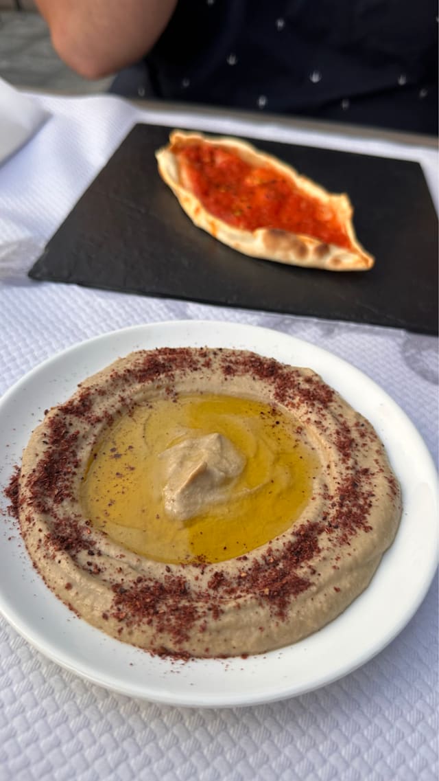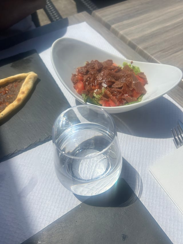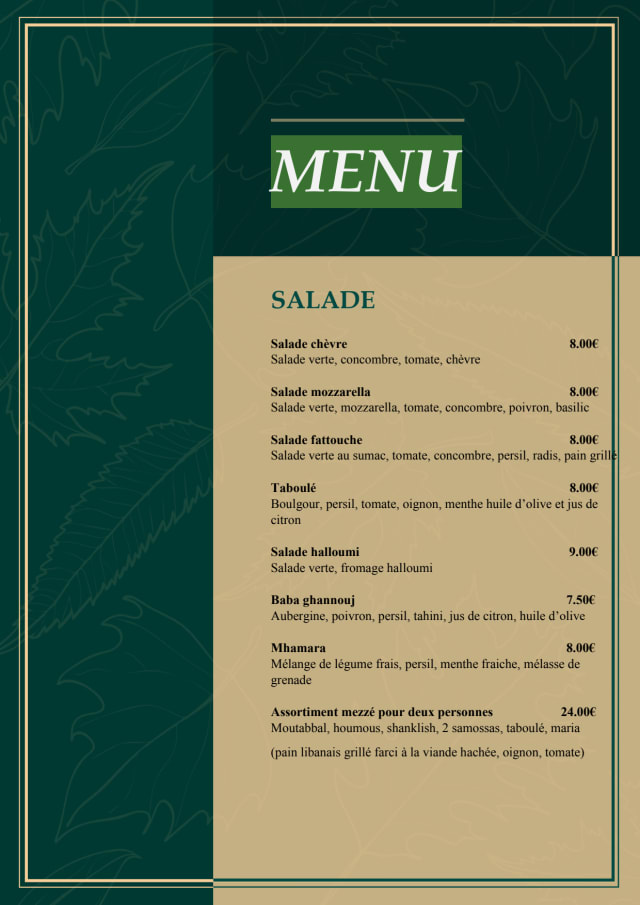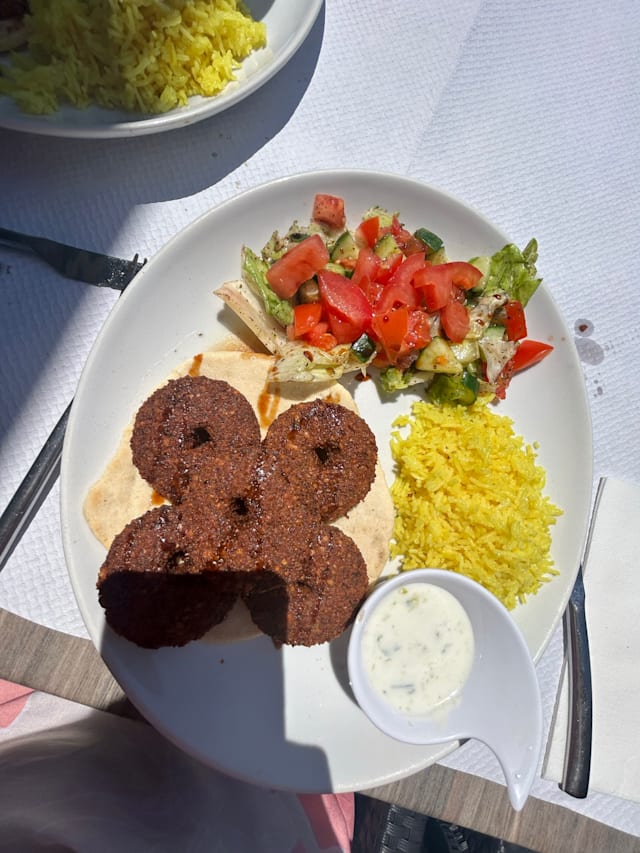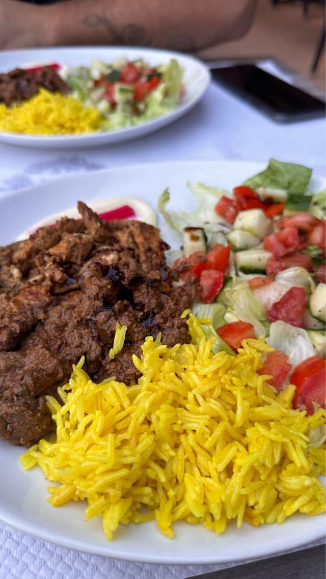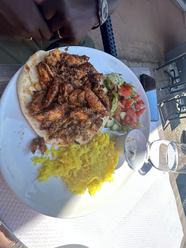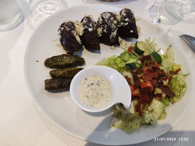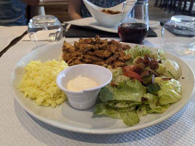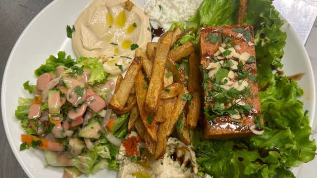 Morceaux de poulet marinés citronnés et parfumés aux épices, salade verte, houmous, moutabbal, frites, aïoli
