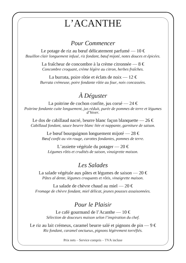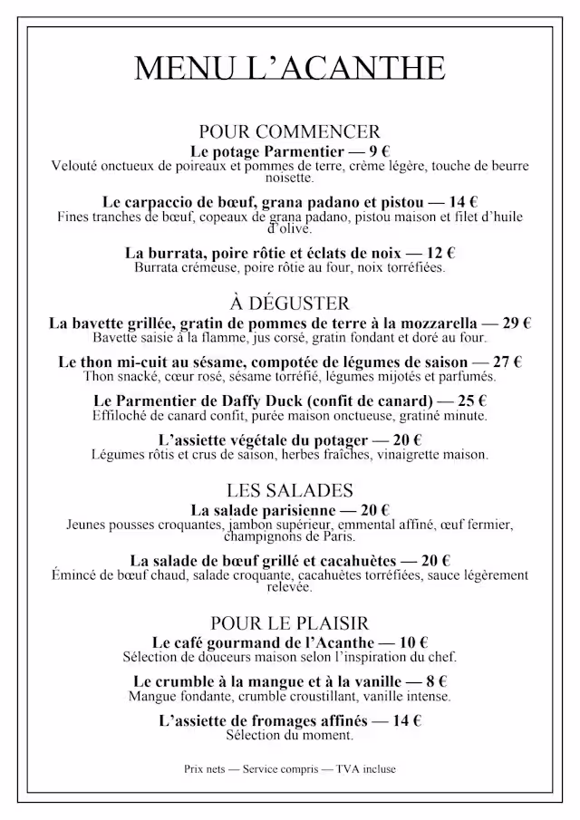 10/10Welcoming bistro ambience. Creative snd interesting menu. Truly one of our best meals in Paris. My wife and I both had squid with stir-fried vegetables and could not stop commenting about how delicious it was.