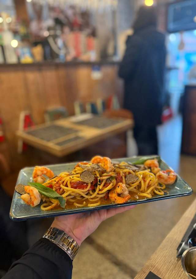 - Base: crème de truffe, bufala | ajout après cuisson: bresaola, ricotta, noix, basilic