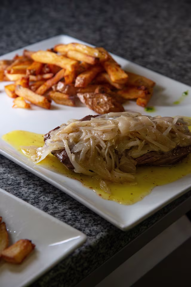 - Bavette Irlandaise, échalote au beurre. Servi avec frites et salade.