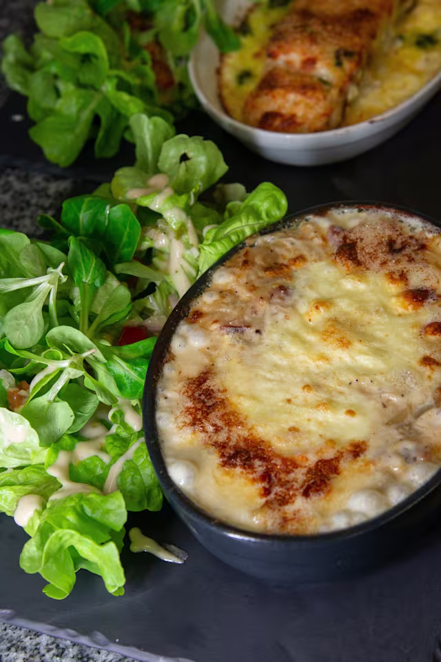 - Diots gratinés, fromage Saint Marcellin, vin blanc, oignons. Servi avec frites et salade.