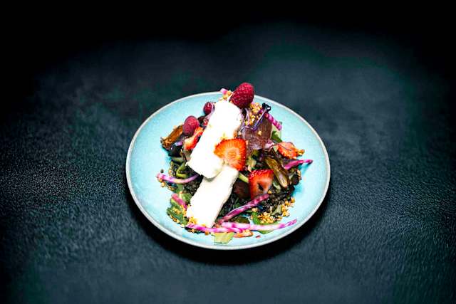 - Ecrasé de potimarron, poêlée de poireaux et champignons de paris caramélisés déglacés au ponzu (soja/yuzu), sarrasin torréfié