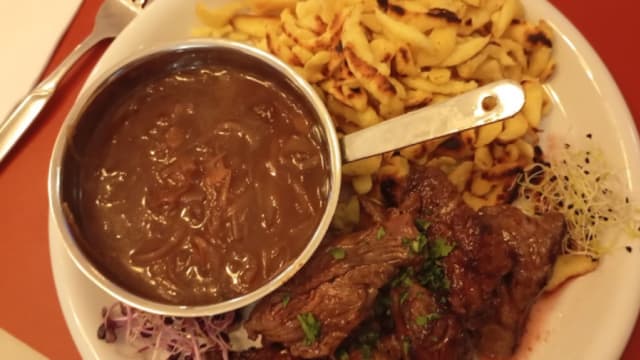 - Accompagnement au choix: frites/ spaetzle/ pommes de terre sautées/ légumes de saison