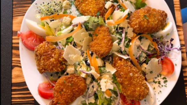 - Salade / tomates/ oignons / aiguillette de poulet/ parmesan / croutons / oeuf dur
