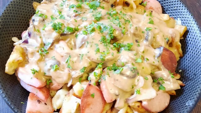 - Jambon, champignons et fromage rape servie avec frites et salade
