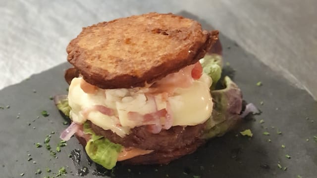 - 2 steaks, 1 galette de pomme de terre au centre, bacon, cheddar, oeuf au plat, sauce BBQ
