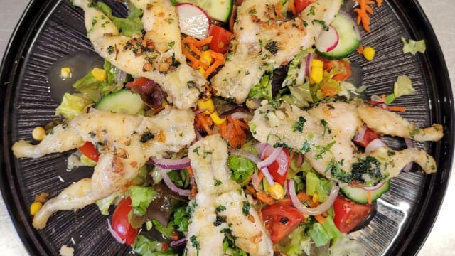 - Salade verte, tomates, mais, concombre, oignons rouges, oeuf dur, croutons, copeaux de parmesan, poulet pane croustillant, sauce cesar