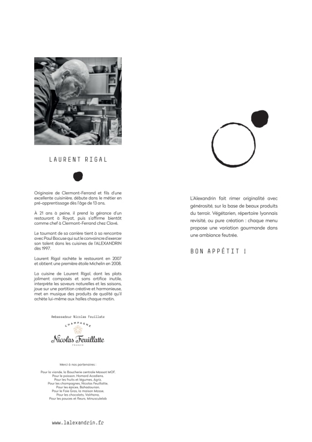 10/10We had a wonderful dinner with charming attention from Chef Laurent Rigal and the knowledgeable server as well. Our welcome was warm; we loved the comfort of the room, the music was nice (and not too loud) and the chairs were comfortable. We shared everything and ordered only one menu, as usual, but we were served three amuse-bouche anyway! One was a tiny Mexican-inspired soup with a spicy ball of gel inside. It was creative and amused our bouche. We were served a tiny brioche as well as bread and butter. Chef Laurent was entertaining, and the server explained every dish well. For our starter, we had the Arctic char, and it was delicious. For our main, we shared the Bresse poultry; it was a creative way to serve it, and we enjoyed it. We were served pre-dessert and mignardise. We truly enjoyed Chef Laurent's generosity. For dessert, we had the Peach mint cream--excellent! L'Alexandrin was our 21st dinner in a restaurant in Lyon and it was our best!
