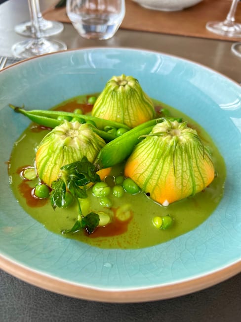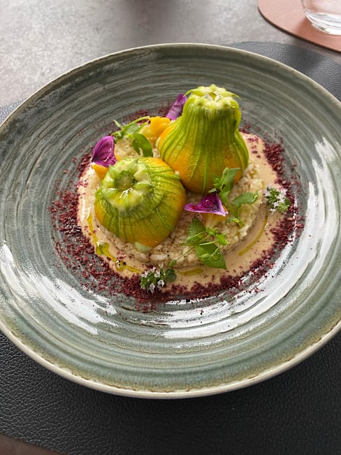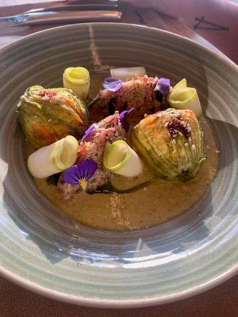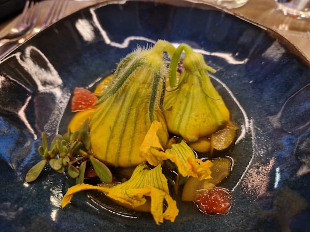 10/10+1My family and I came in for the 3 course set menu and this by far exceeded any expectations we had. Everything was delicious! The staff were very friendly and the restaurant is charming. It was a windy day so we sat inside and admired the view through the windows. The first course of stuffed zucchini flowers was exceptional, such delicate flavors married together in one dish. The second course was the pork shoulder and my personal favorite. It was bursting with flavor. In between waiting for our final desert course we were presented with the opportunity to try an additional amouse bouche course. I highly recommend that you do this if offered, it didn’t add too much extra to the bill and it was delectable. Most of us opted for the granita which was very refreshing and my husband had the cheese plate which was also tasty. The final course was the dessert and even though we were all mostly full by then we managed to eat every bite. I highly recommend you visit this place if you have a chance. Also, the recommended wine pairing with each course is spot on and enhanced the meal tremendously.