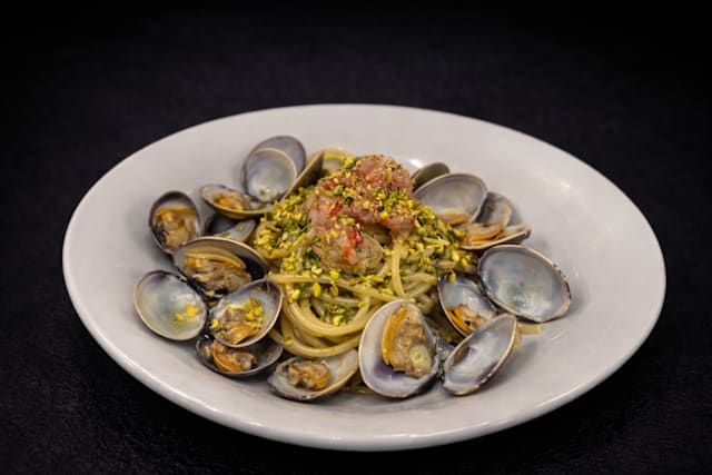 - Spaghetto alle vongole veraci - e battuta di gambero e pistacchio