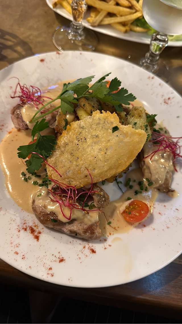 - Epaule de veau braisée au miel, pommes grenailles rôties, trio de carottes confites, jus corsé