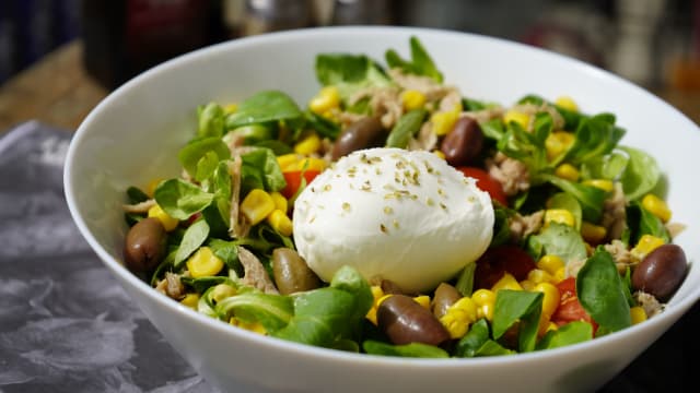 Mix insalata (valeriana e rucola), salmone affumicato, avocado, pomodorini, mais, olive nere, crostini di pane