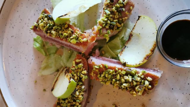 Tagliata di tonno con pistacchio, mela verde grigliata e vellutata di patate