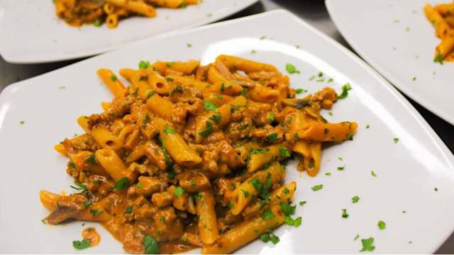 - Rigatonicon salsa amatriciana, uova pasta gialla pastorizzati, salsiccia, guanciale, pecorino romano stagionato