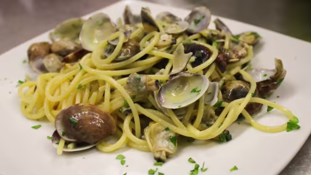 - Tagliatelle con polpa di astice, gambero, pomodorini gialli e rossi confit, olio d'aglio, pepe, sale