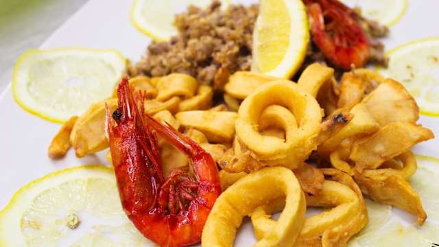 - Frittura di calamari, gamberone, calamaretti, seppioline con insalata mista, verdure grigliate, bruschetta con pomodoro e stracciatella, salsa agropiccante