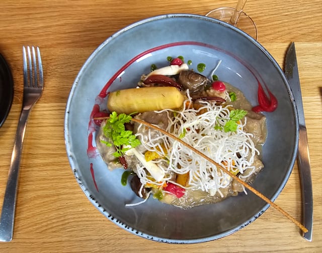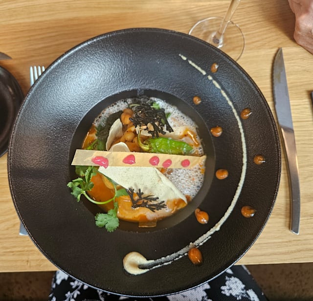Morue, œuf mollet GRTA, oignons confits, siphon d’agria GRTA, piquillos, olives taggiasca D.O.P et nid de vermicelles kadaïf.