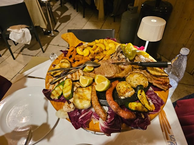 Antipasto rustico, fritturine miste, primo del giorno, secondo del giorno, contorno, bevanda, dolce della casa, amaro o caffè. Servizio e coperto non inclusi