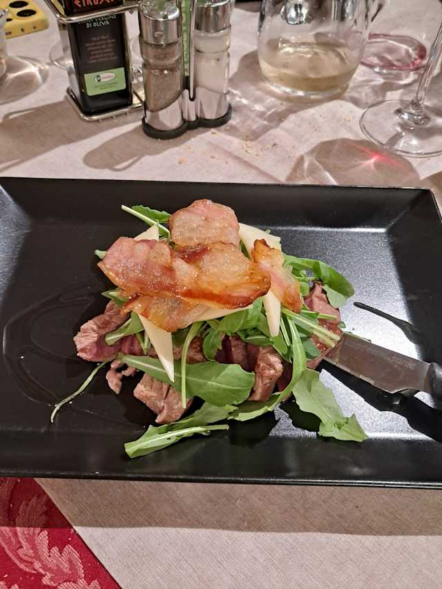- La tagliata di controfiletto con pancetta di cinta senese, rucola e pecorino