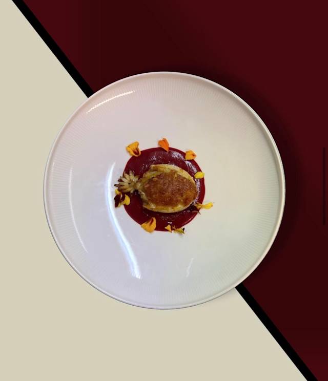 - Seppia ripiena con gamberi e patate, crema di rapa rossa