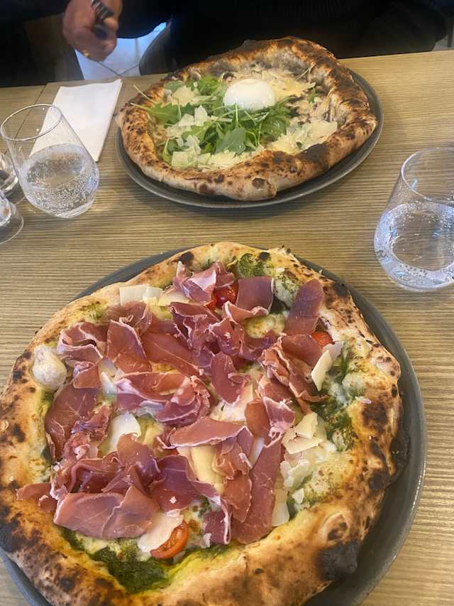 - Pesto, fior di latte, jambon de parme, tomates cerises, roquette, copeaux de parmesan