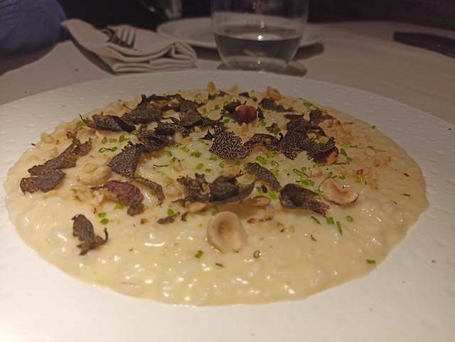 - Risotto hokkaido, nocciole tostate, crumble di amaretti, glassa al vino rosso.