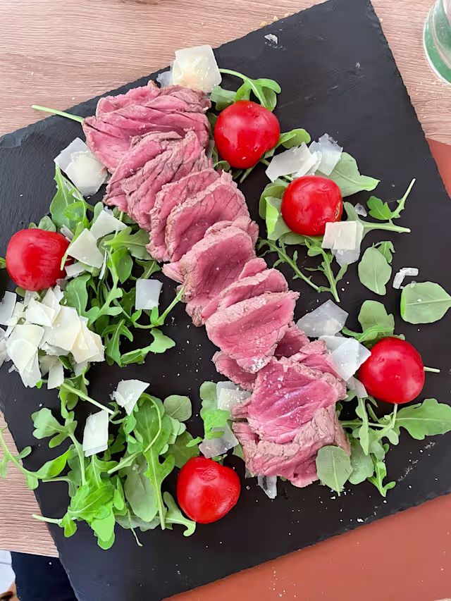 - Tagliata di fassona piemontese con rucola, grana pomodorini e sali aromatici