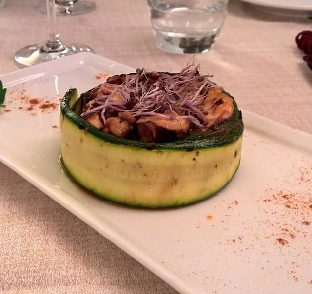 Polenta grigliata con fonduta di branzi e zucchine alla griglia