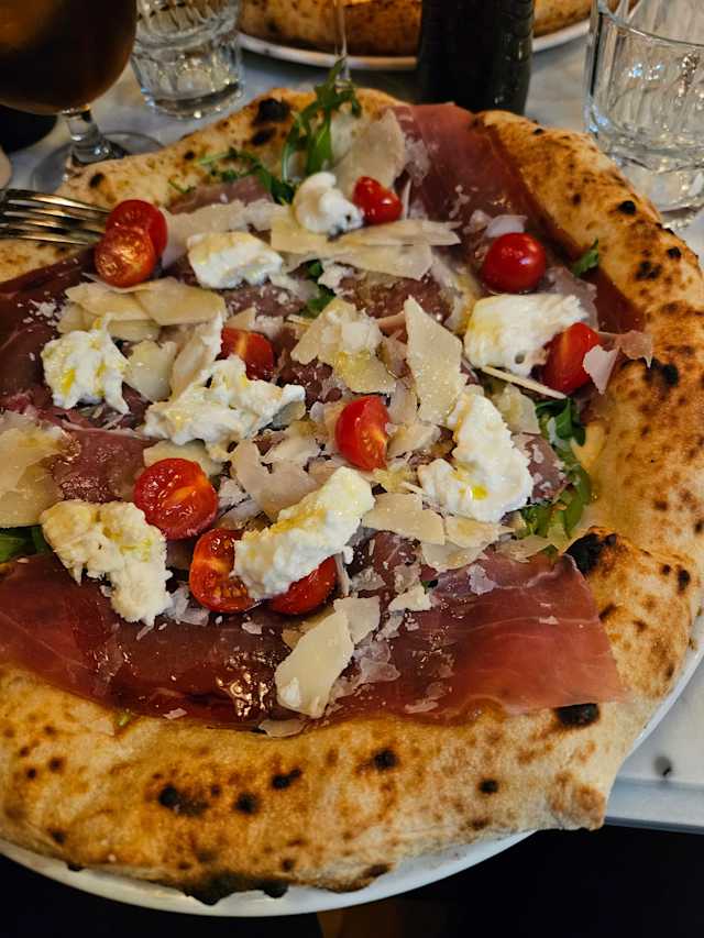 - Mozzarella, lufttorkad skinka, buffelmozzarella, körsbärstomater, ruccola, grana padano