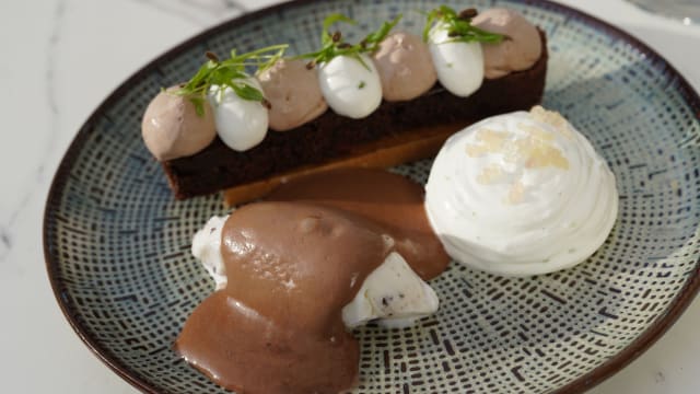 ( génoise au café, crème mascarpone, oeufs et vanille, chocolat râpé et sauce chocolat )