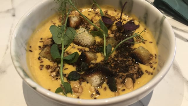 ( moules, coques, échalotes, ciboulette, citron, huile d’olive et fêta crème de maïs, brioche grillée, siphon chaud de moules, mini basilic )