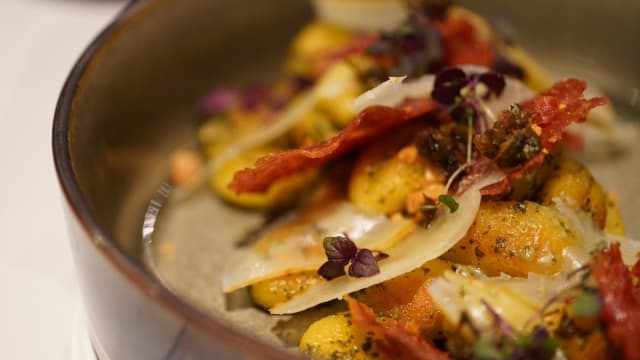 ( 180gr de chiffonnade de porchetta, carré de cochon dégraissé roulé aux herbes crème de chèvre frais, estragon, noisettes, citron, pommes grenailles, brioche grillée )