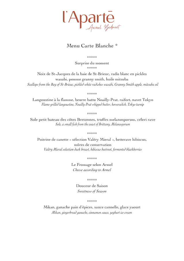 10/10+2Excellent food, the Chef, the crew, all was perfect for closing our week. Nex time we'll try the full 9 courses menu. Thanks for a very nice moment.