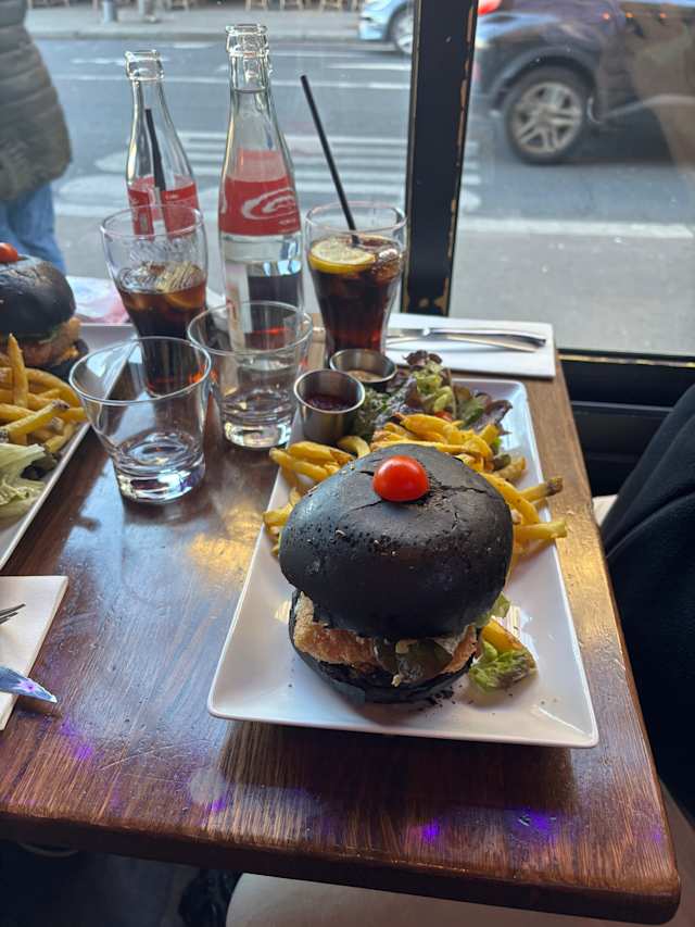 - (Steak haché, cheddar, salade verte, tomate, oignons confits, pickles, sauce tartare frites maison)