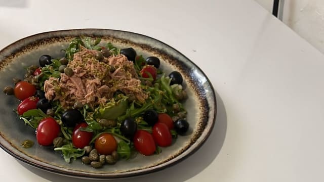 - thon, salade mixte, oignon, tomate, câpre, olive