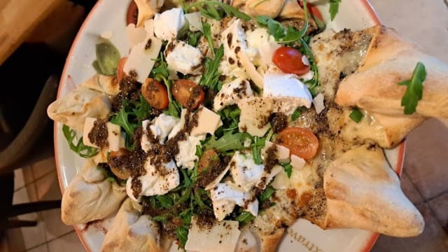 - sauce blanche, Burrata, tomate cerise, roquette, l’huile de truffe, parmesan