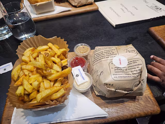 - Burger petit gourmet "Halles" + Frites 1 sauce au choix + Boisson eau ou soft